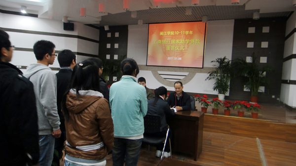 1月6日上午,校学生资助管理中心在学术报告厅举行2010级新生工商银行助学贷款合同面签仪式。来自工商银行洪山支行的6位信贷员分成3个审核小组同时受理学生贷款申请。当日共有108名同学顺利通过初审,预计每学年获得助学贷款共计40万元,四个学年共计将发放助学贷款146万元。据工行信贷员反映,由于今年各院系材料整理比较规范,审核工作才得以高效、顺利进行。