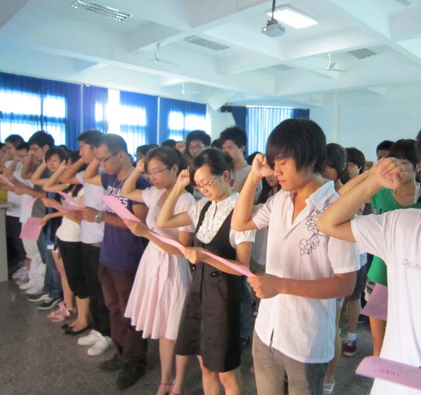 在庆祝建党90周年之际,地理科学系党总支举办了新党员宣誓会议。地理科学系党总支书记许厚云、党务秘书许雪峰、系团委书记李廷旺以及70多名新党员参会。