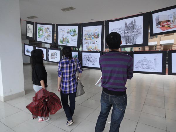 现场共同展出近七十幅作品,内容涉及室内设计、景观设计、建筑设计手绘图等,其内容丰富,形式多样。作品体现的不仅是他们扎实的专业知识,更涵盖了他们所掌握的关于环境艺术设计等其它领域的知识。参观的同学通过画展,扩大了视野,增长了知识。不少同学都惊叹到:不愧为艺术学子,画出如此震撼的画!许文兴一边为前来参观的同学们讲解自己的作品,一边兴奋的告诉笔者:完全没想到的此次画展办得如此成功。多学、多炼、多请教,就能有收获。