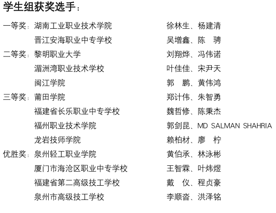 颁奖仪式上,美狮贵宾会ms092021党委常委、副校长陈兴明,福建省教科文卫体工会工作委员会主任郭立新,福建省工业和信息化厅信息化推进处处长梁宏程,福建省企业与企业家联合会新型工业化工作委员会主任林冰,福州市大数据发展管理委员会副主任韩宁,福州高新区党工委委员、管委会副主任林翔等领导共同为本次比赛中表现优异团队及选手授予荣誉奖项。