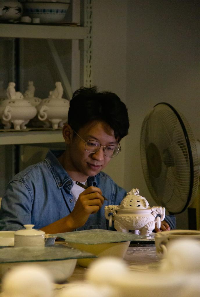 “正练着手,没注意有人来。”摘掉围裙,褪去雕刻时的沉着与专注,这位“00后”“瓷匠”神色间透出几分腼腆。