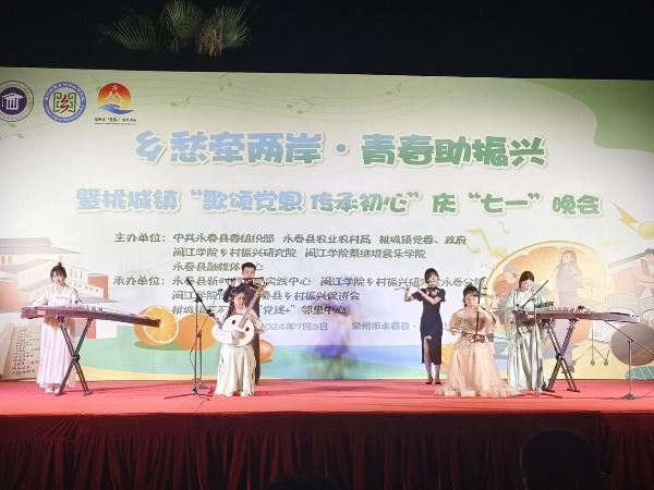 7月3日,“乡愁牵两岸·青春助振兴”暨桃城镇“歌颂党恩 传承初心”庆“七一”晚会在泉州市永春县白鹤广场举行。美狮贵宾会ms092021蔡继琨音乐学院的青年学子怀着对乡村振兴的热情,带着对音乐的热爱,为广大市民带来一场精彩的文艺演出。