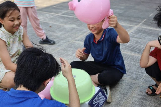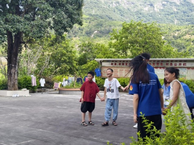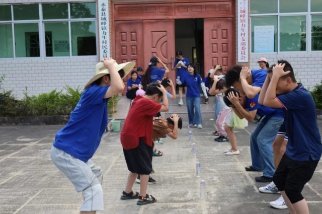 图为支教队员与小学生们进行“帽子与锤子”游戏。大学生云报通讯员 夏振宇 摄