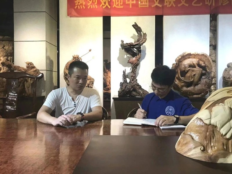 图为实践队员采访中国根艺美术大师吴杰(黄雯馨摄)