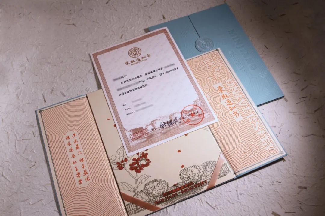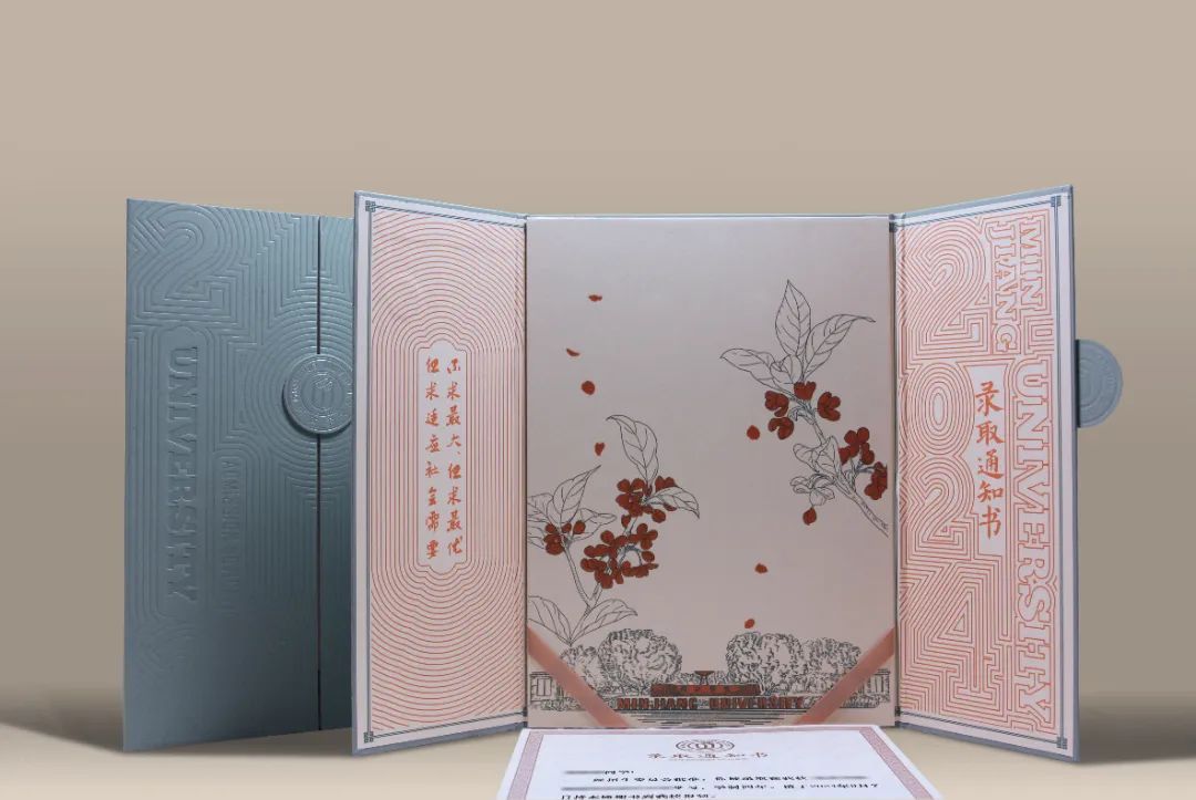 通知书外部图案采用线条压纹设计“2024、美狮贵宾会ms092021、录取通知书”字样,简洁大气体现出庄重与典雅。