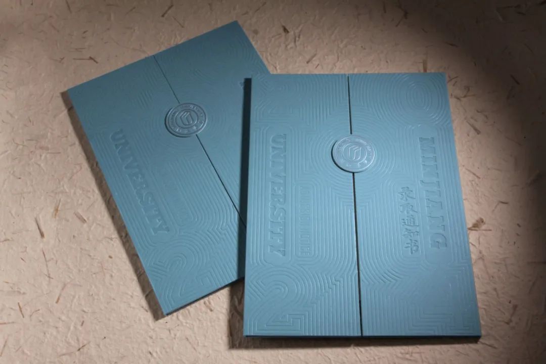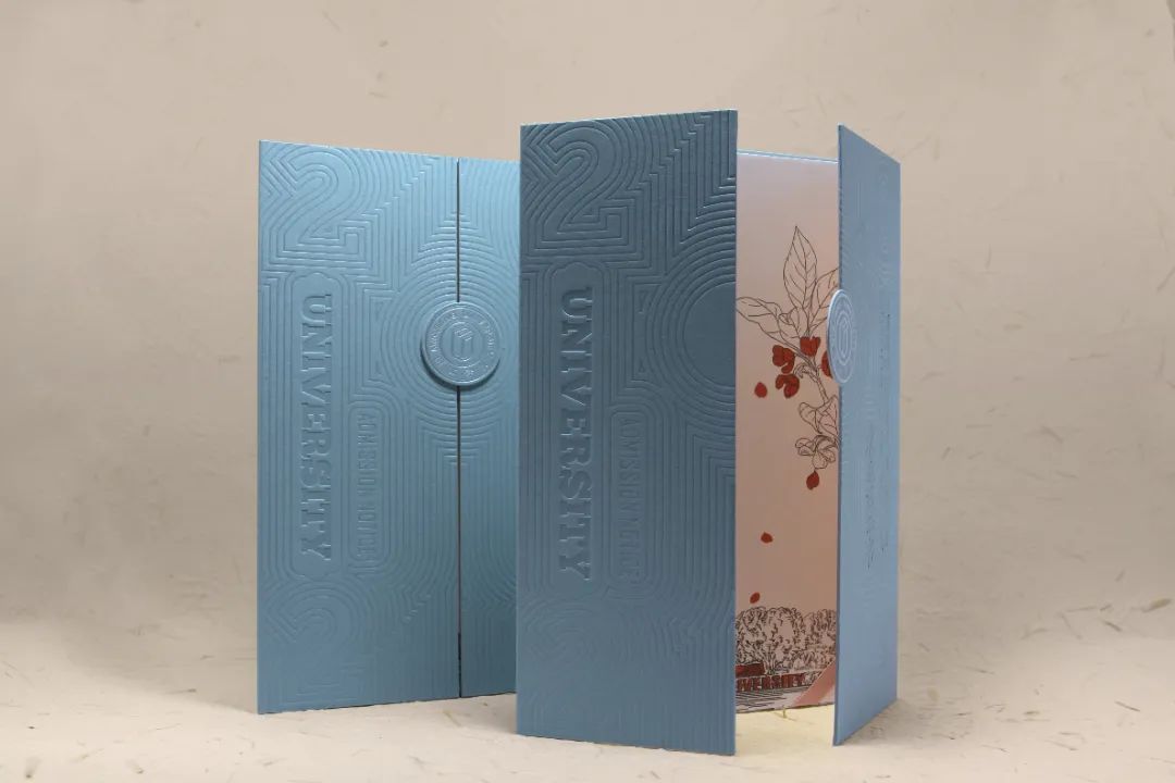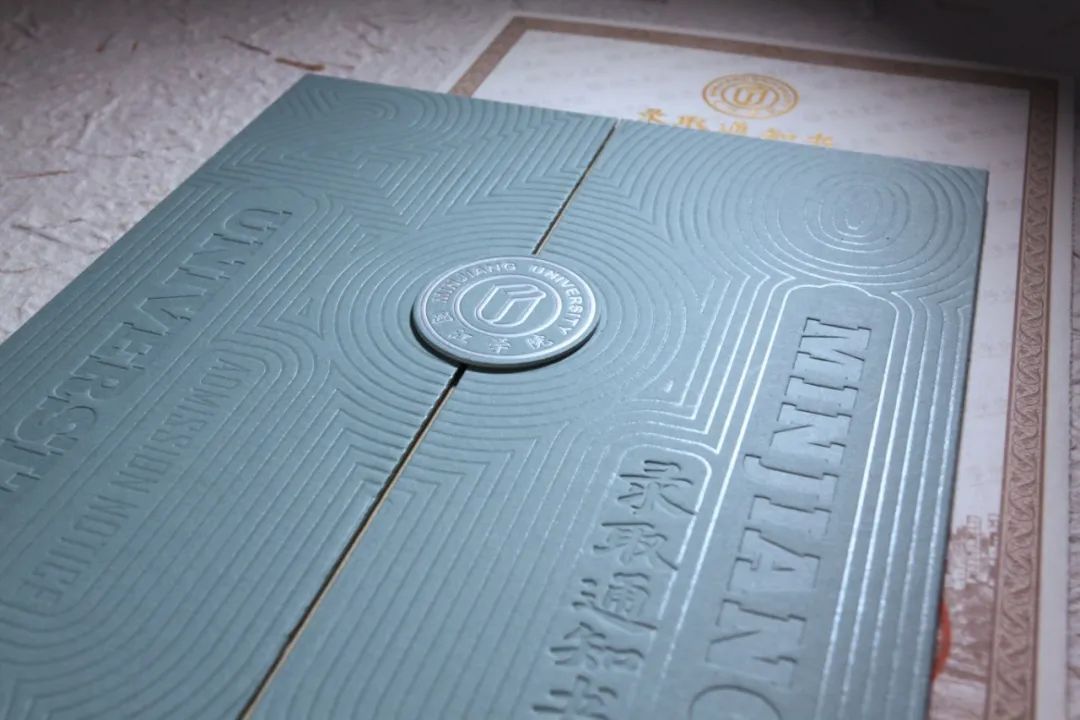 通知书采用对开折页设计,有“继往开来”之意,采用天青色调进行设计,所谓“青出于蓝而胜于蓝”,寓意新生学子经历高中学习苦尽甘来,并在大学学习生涯更进一步。