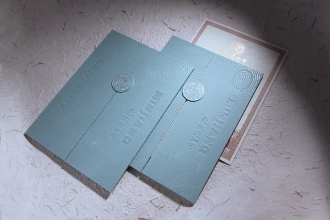 内部采用烫金工艺,中间是学校南门风景配以桂花图案,祝贺学子“蟾宫折桂”收获喜悦。