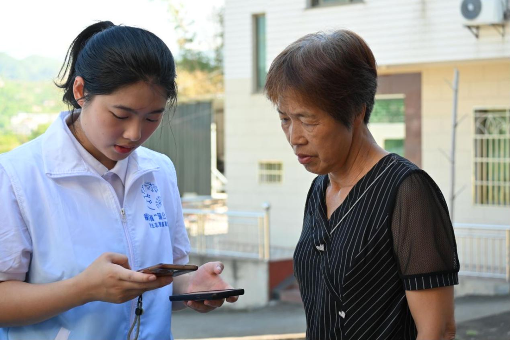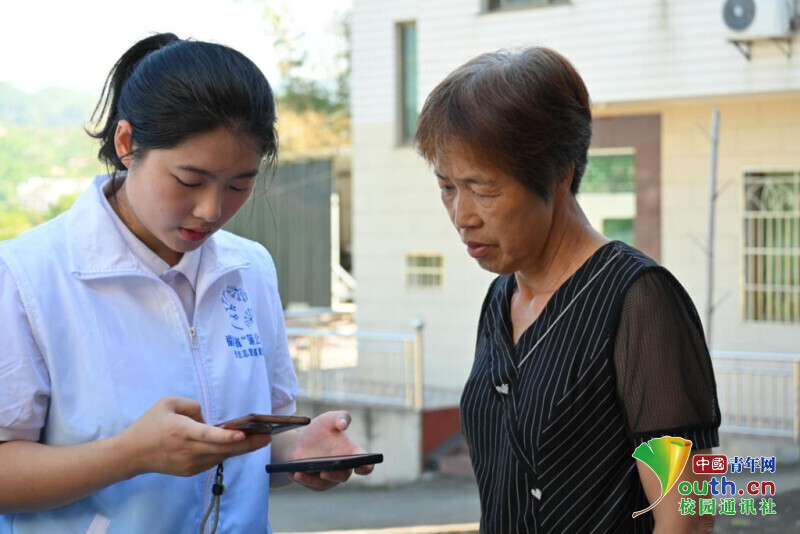 图为服务队队员为当地居民下载国家反诈中心APP。陈媛 供图