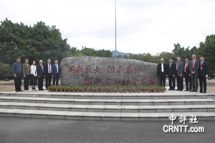 閩江學院黨委書記葉世滿與香港兩岸智庫聯誼會訪問團在寫有“不求最大,但求最優,但求適應社會需要”的校園景觀前合影留念。(中評社圖片)