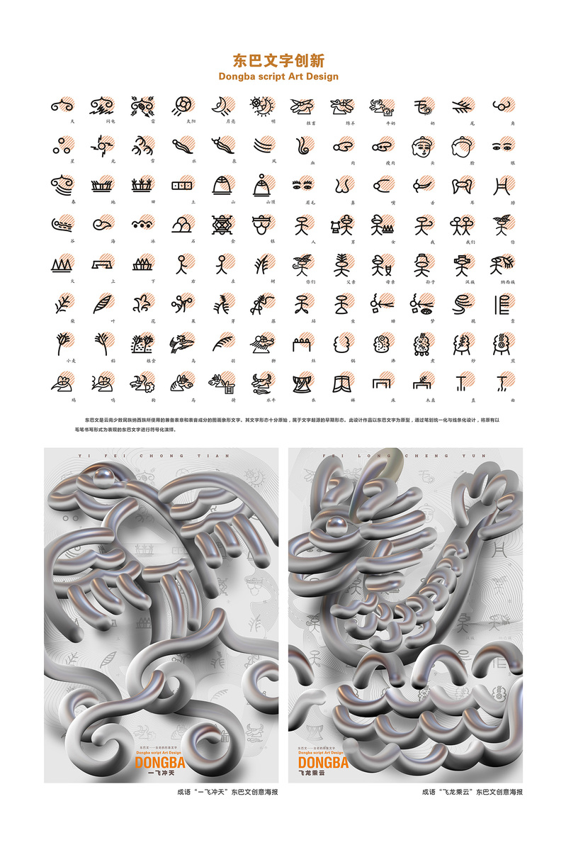 东巴文是云南少数民族纳西族所使用的兼备表意和表音成分的图画象形文字,其文字形态十分原始,属于文字起源的早期形态。陈捷教授以东巴文字为原型,以设计语言激活古老文明的当代生命力,通过笔划统一化与线条化设计,将原有以毛笔书写形式为表现的东巴文字进行符号化演绎并融入现代设计风格将文字笔划进行解构,结合东巴文字含义通过海报载体进行创意设计。该设计作品旨在让更多人了解被联合国教科文组织列入世界记忆名录,同时被称为世界唯一存活着的象形文字、文字“活化石”的东巴文。