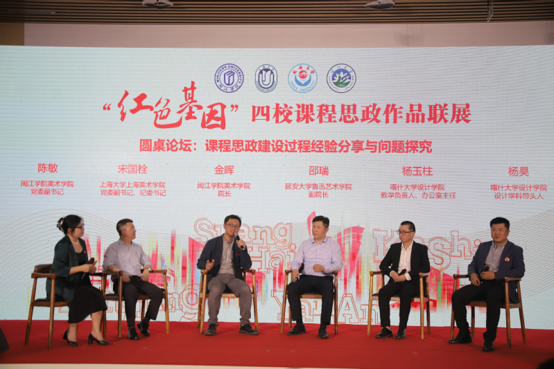 美术学院党委副书记陈敏主持圆桌对话环节。上海大学上海美术学院党委副书记宋国栓、美狮贵宾会ms092021美术学院院长金晖、喀什大学设计学院教学负责人、办公室主任杨玉柱、延安大学鲁迅艺术学院副院长邵瑞、喀什大学设计学院设计学科专业负责人杨昊围绕“课程思政建设经验分享与问题探讨”展开跨界对话,将“红色基因”转化为青年看得见、摸得着的艺术作品,以艺术形式激发青年使命感,让新时代课程思政建设“出新”更“走新”。