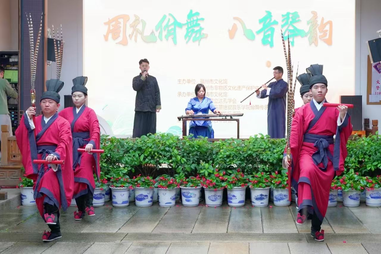 配乐展演《周礼佾舞·诗经鹿鸣》、笛子独奏《扬鞭催马运粮忙》、古琴独奏《云水禅心》等10多个节目依次上场,整场展演活动以“八音雅韵”的琴声、庄重大气的佾舞来展现中华礼乐文化的博大精深,让市民游客在沉浸式的“非遗+旅游”体验模式中感受闽都传统文化魅力。