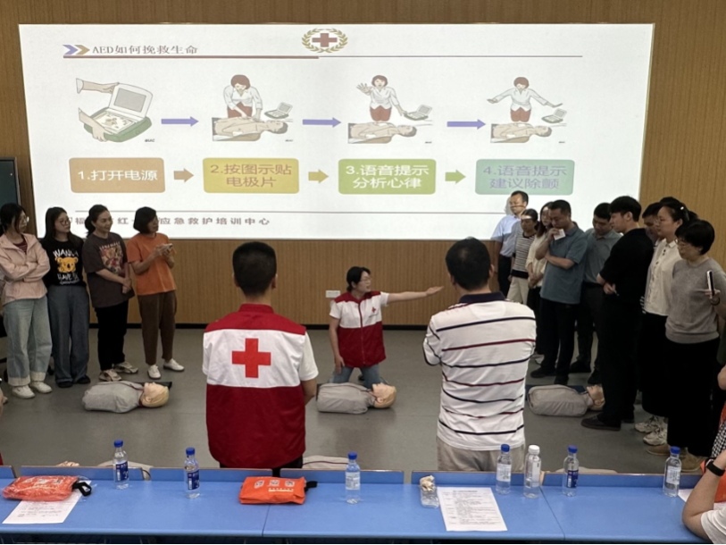 在体系构建方面,学校构建了“三维一体”急救教育机制,通过设施标准化、师资专业化、培训常态化建设,形成覆盖急救知识普及、技能实训、资格认证的完整教育链条。现已配备7台AED设备,合理分布于田径场、教学楼等人员密集区域,实现“黄金4分钟”急救圈全覆盖。