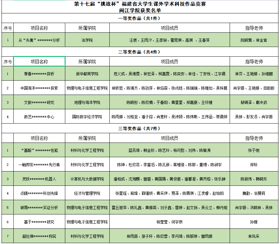 近日,第十七届“挑战杯”福建省大学生课外学术科技作品竞赛终审决赛在福州大学举行。经过激烈的角逐,我校共荣获省奖12项,其中一等奖1项,二等奖4项,三等奖7项。