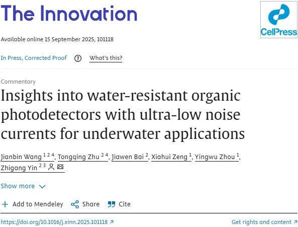 近日,我校物理与电子信息工程学院王建彬副教授、曾夏辉教授和周赢武教授联合重庆大学电气工程学院、输变电装备技术全国重点实验室尹志刚教授团队,以一作第一单位在影响因子为25.7 的中国科学院一区TOP期刊《The Innovation》上发表了题为《Insights into water-resistant organic photodetectors with ultra-low noise currents for underwater applications》的论文。该论文从面向水下领域的重大应用需求从发,通过探讨与优化有机光电探测器关键组成部分等的协同设计策略以提升器件性能,构建适用于水下环境的高性能防水有机光电探测器,为极端环境应用中的下一代柔性探测器提供前瞻性思考与可行性技术路径。