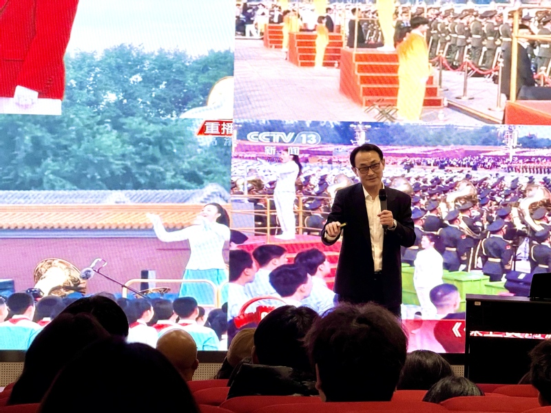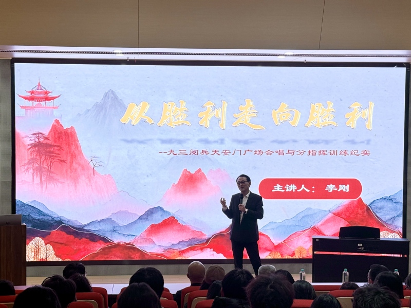 李刚教授以“九三阅兵”天安门广场三千人合唱训练纪实为主线,将艺术审美与思政教育深度融合,围绕“以美育人、以文化人”核心理念,以“大礼与天地同节,大乐与天地同和”为脉络,串联起抗战记忆与爱国情怀。通过详述14年抗战历程、解读九三阅兵意义、揭秘合唱团选拔训练细节、赏析纪念大会暖场合唱作品等环节,以一个个具象故事和专业解析,让在场师生深刻感受到艺术背后的精神力量,体悟到爱国担当的时代召唤。