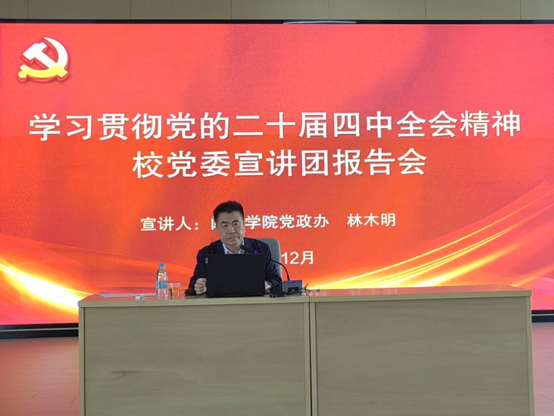 12月17日,美术学院在艺术楼C401会议室召开学习贯彻党的二十届四中全会精神宣讲报告会,校党委宣讲团成员、党政办公室主任林木明作专题报告。美术学院全体教职工、学生党员参加会议,报告会由院党委副书记陈敏主持。