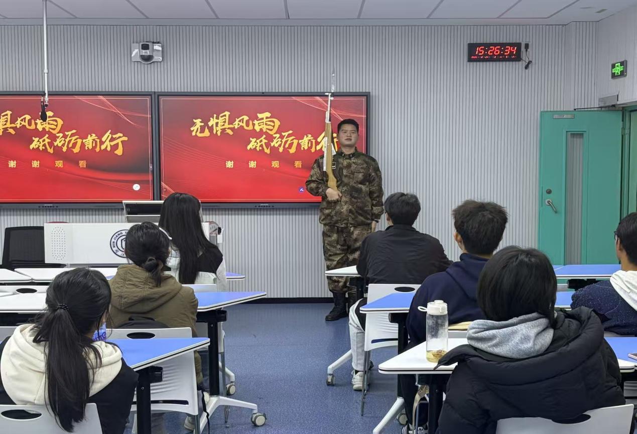 冯建镇曾参与纪念中国人民抗日战争暨世界反法西斯战争胜利70周年阅兵等多项国家级重大仪仗司礼任务。他结合自身服役经历,生动讲述了仪仗队员如何以“百步不差分毫,百秒不误毫厘”的绝对标准,完成每一次升旗任务与国家仪仗使命。通过真实感人的故事,他深入阐释了国旗的深刻内涵、设计寓意与礼仪规范,强调“守护国旗尊严就是守护国家尊严”,引导学生牢固树立“国防有我”的责任意识。