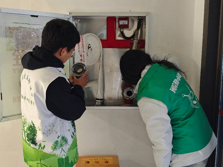消防安全是校园安全工作的重中之重,关乎每一位师生的生命财产安全与校园的稳定和谐。志愿者们详细了解此次检查的具体内容及注意事项后,便分组行动,针对教学楼的所有消防设施进行逐一巡检。志愿者们对消防箱进行了细致的内部检查,重点查看了消防水带、喷枪等关键部件,确保器材齐备、无破损、无堵塞。同时,志愿者还对箱内灭火器进行了全面排查:检查罐体有无变形、损伤,确认压力表指针处于绿色有效区域,核查安全封条与保险销是否完好,并逐一核验了灭火器的有效期,确保所有消防设备在紧急情况下可正常使用。