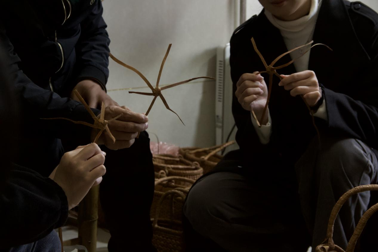实践队成员在传承人指导下体验藤编挂件制作 齐楚涵供图